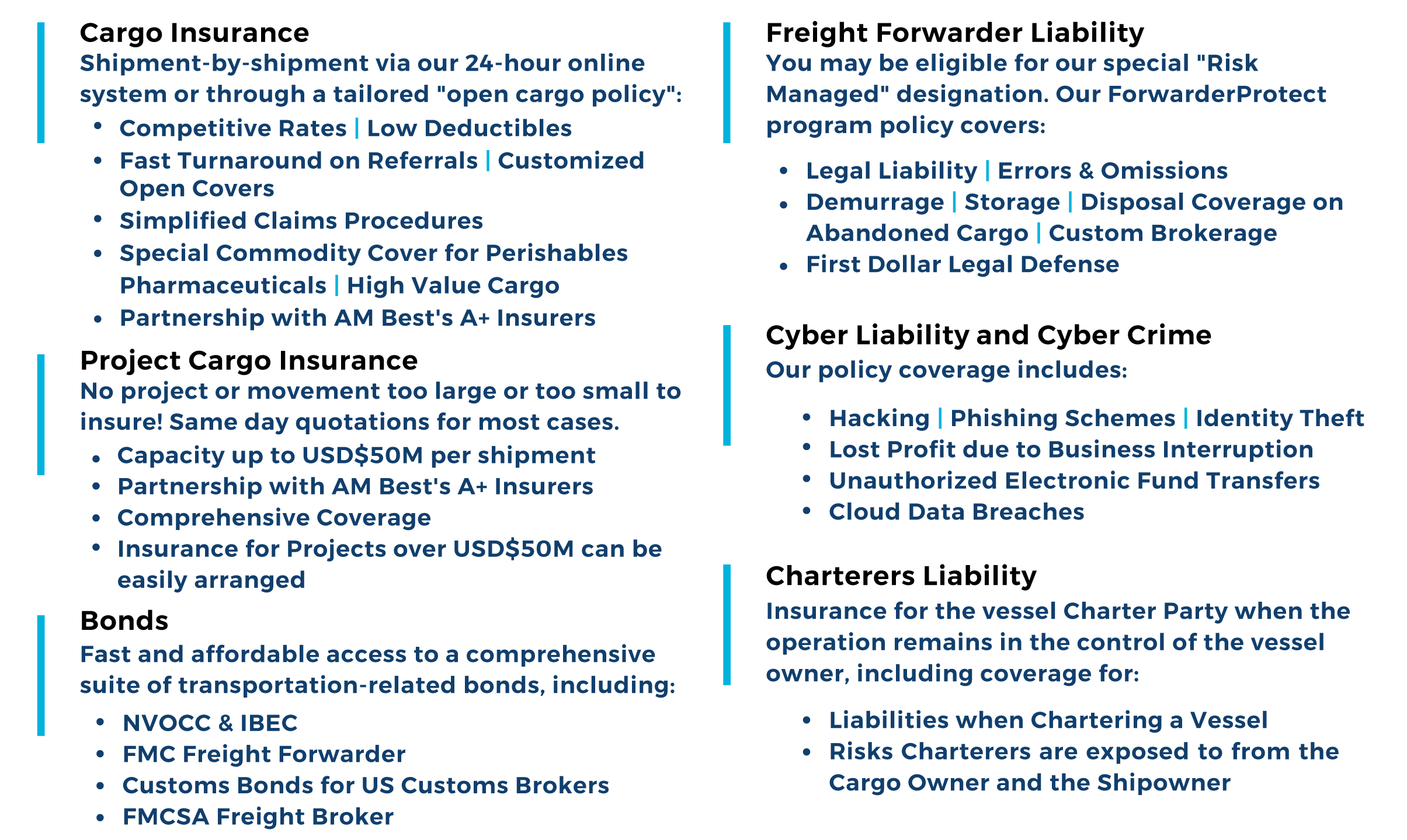 World Insurance offers a suite of risk management solutions, including Cargo Insurance, special Project Cargo Insurance, Transportation Liability and Errors & Omissions (“ForwarderProtect”), Bonds, Cyber Liability, and Charterers Liability insurance.